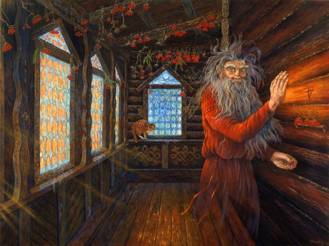 Стоит зимняя пора. За окнами терема студено. Да и в коридоре довольно прохладно. Лишь уходящий день пропускает через слюдяные окна слабеющий вечерний свет солнца. Дух терема медленно движется вдоль бревенчатой стены, за которой теплота и уют просторной горницы. Маленькая полочка с ягодами рябины – знак уважения обитателей терема к своему домовому. Кот на заиндевелом подоконнике зорко смотрит на полупризрачную фигуру. Он непременный спутник духа дома.