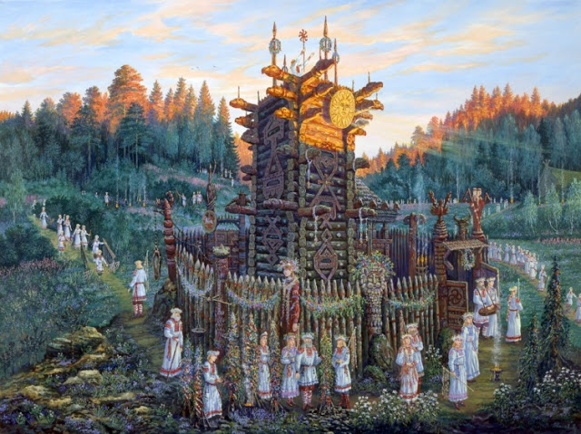 тро Летнего Солнцестояния. К храму Числобога движутся процессии местного рода русичей. Ограду частокола украшают столбы с изображениями зодиакальных знаков. На вершине башни жрец божества держит в правой руке священный диск с письменами. Левая рука крепко сжимает рукоять меча. Позолоченный диск-календарь укреплен на вершине конструкции башни. Числобог у древних русов ведал ходом времени, которое делилось на множество различных отрезков: как огромных эр и эпох, так и месяцев и дней.