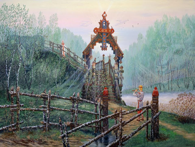 3нак на крыше ворот означает символ входа в Правь,–олицетворение развития и развития будущего. В узоре деревьев и листвы можно прочитать лики Овна и Тельца