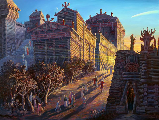 In the night sky appeared tailed star (comet). The appearance of the tailed star was an unusual event for the residents of the ancient city of Slovenska. They are solemn in their way and watching the sky. Sun on the decline, but its terms are no longer visible. It obscures the temple shown at the bottom right of the painting. However, the rays of sunset, like arrows, pierce the evening haze.