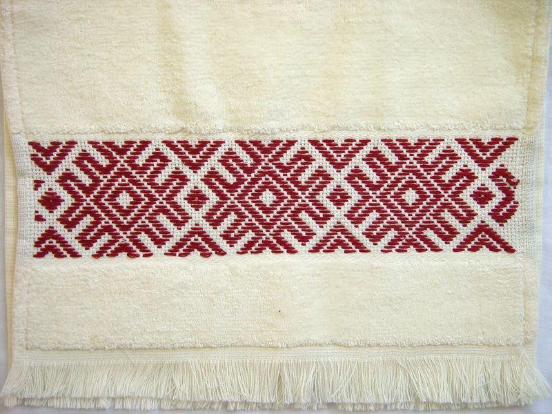 Once translated to a contemporary language, this design means “Unity and Harmony of Male and Female Powers of Nature, Soul, Body, and Family”. Red pictographs (crisscross patterns similar to tic-tac-toe boards) represent sacrifice of bread (burning it in sacred fire) to thee main male spirits: Sun, Fire, and Thunderstorm. White figures between the pictographs symbolize the Mothers of the World. Their heads are crowned with horns. According to ancient beliefs, Mothers have another appearance (beautiful “vazhenki,” or female elk).